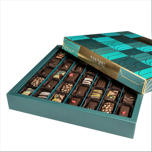 Elegáns artdeco design dobozaink is felkerültek webáruházunkba. A kisebb méretű bonbonos és trüffeles dobozok mellett nagyobb kiszerelésben is megjelennek. Nagy artdeco bonbonválogatásunk 35 db kézműves bonbont rejt magában.